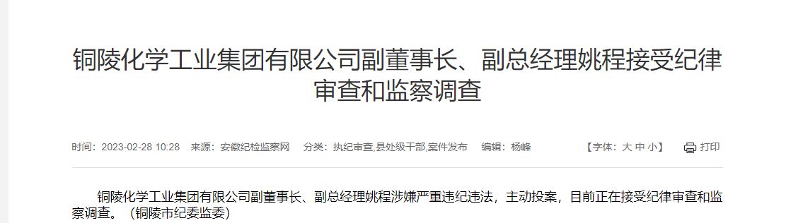 2月28日,安徽紀(jì)檢監(jiān)察網(wǎng)發(fā)布消息,銅陵化學(xué)工業(yè)集團(tuán)有限公司(簡稱“銅化集團(tuán)”)副董事長、副總經(jīng)理姚程涉嫌嚴(yán)重違紀(jì)違法,主動投案,目前正在接受紀(jì)律審查和監(jiān)察調(diào)查。