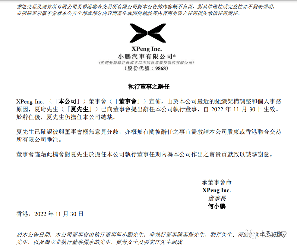 不久前,夏珩更是接連卸任廣東小鵬汽車科技有限公司、廣州小鵬汽車科技有限公司職務(wù),并均由何小鵬接任。2022年11月30日,小鵬汽車發(fā)布公告稱,因公司組織架構(gòu)調(diào)整及個(gè)人事務(wù)原因,小鵬汽車聯(lián)合創(chuàng)始人、總裁夏珩將辭去公司董事會(huì)執(zhí)行董事職務(wù),11月30日生效。辭任執(zhí)行董事后,夏珩仍將擔(dān)任小鵬汽車總裁一職。
