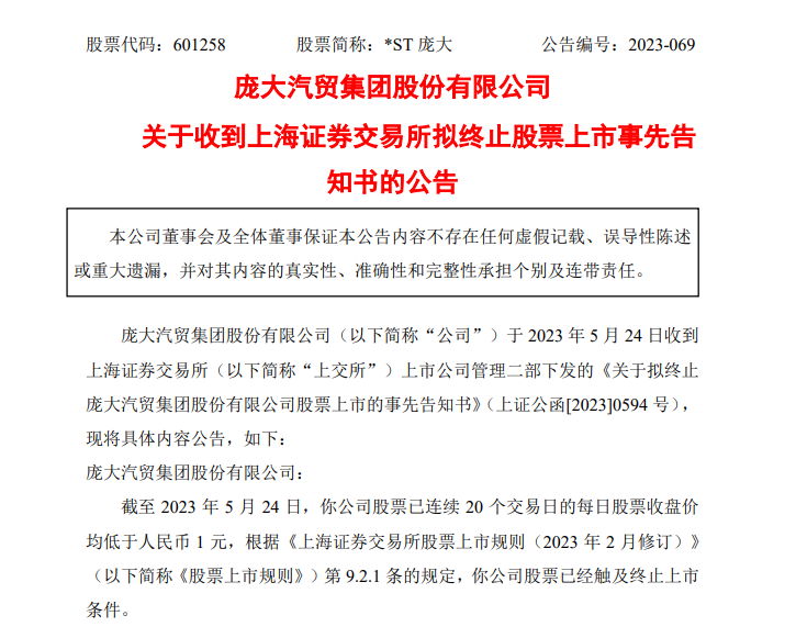 《告知書》顯示,截至2023年5月24日,龐大集團(tuán)股票收盤價已連續(xù)20個交易日低于人民幣1元,根據(jù)《上海證券交易所股票上市規(guī)則(2023年2月修訂)》規(guī)定,龐大集團(tuán)股票已經(jīng)觸及終止上市條件,上交所依據(jù)相關(guān)規(guī)定對龐大集團(tuán)股票作出終止上市的決定。
