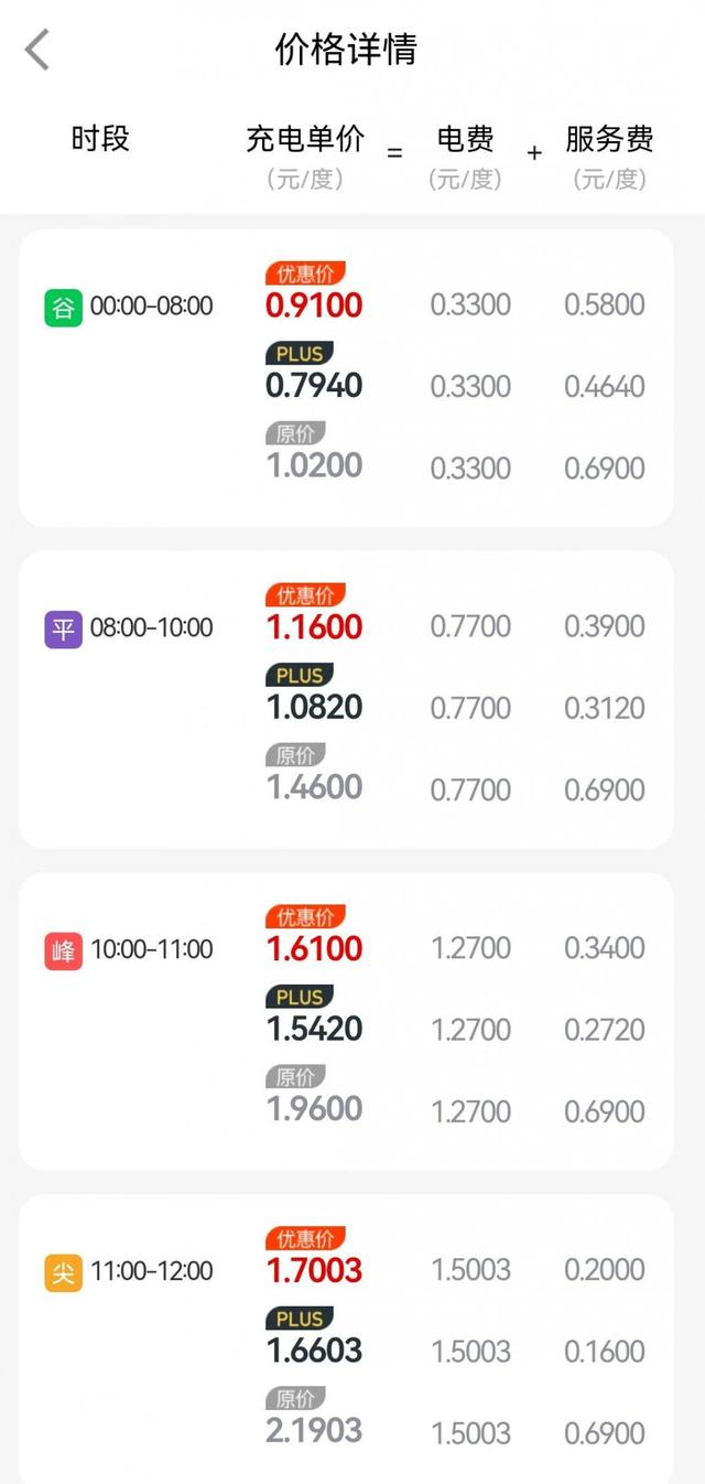 縱向?qū)Ρ瓤?,?月3日越秀公園充電站為例,谷時(shí)是凌晨到次日8:00,充電價(jià)格為1.02元/度;平時(shí)是8:00-10:00、12:00-14:00、19:00-24:00,充電價(jià)格為1.46元/度;峰時(shí)是10:00-11:00、14:00-15:00、17:00-19:00,充電價(jià)格為1.96元/度;此外,尖峰時(shí)段為11:00-12:00、15:00-17:00,充電價(jià)格為2.19元/度。通過(guò)計(jì)算可以發(fā)現(xiàn),尖峰電價(jià)大約是谷時(shí)電價(jià)的2.15倍。