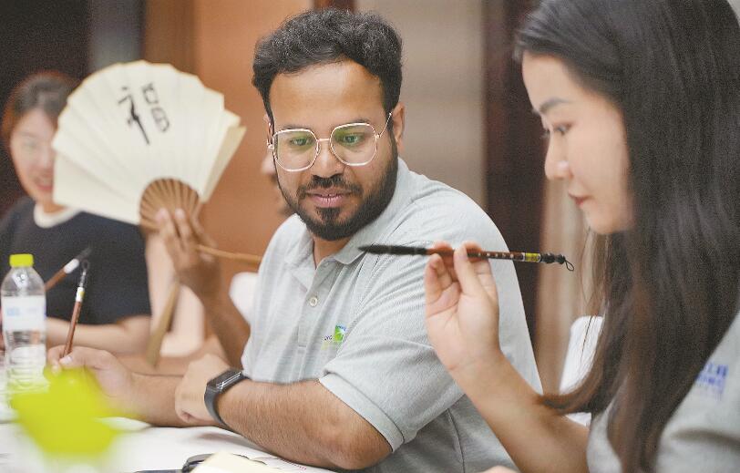 “學(xué)漢字,畫(huà)扇面”活動(dòng)也得到留學(xué)生們的好評(píng)。專業(yè)書(shū)法老師介紹了漢字的起源和發(fā)展,指導(dǎo)他們從基本的運(yùn)筆學(xué)起,最終將“福”字這一學(xué)習(xí)成果展現(xiàn)在各自的扇面上。大家熱情高漲,甚至自主延伸,將中文和阿語(yǔ)結(jié)合。