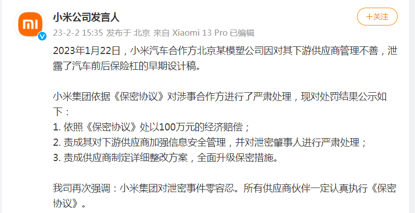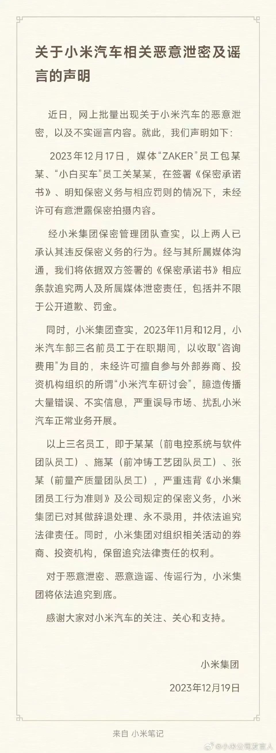 《聲明》稱,2023年12月17日,媒體“ZAKER”員工包某某、“小白買車”員工關(guān)某某,在簽署《保密承諾書》、明知保密義務(wù)與相應(yīng)罰則的情況下,未經(jīng)許可有意泄露保密拍攝內(nèi)容。經(jīng)小米集團保密管理團隊查實,以上兩人已承認其違反保密義務(wù)的行為。經(jīng)與其所屬媒體溝通,小米集團將依據(jù)雙方簽署的《保密承諾書》相應(yīng)條款追究兩人及所屬媒體泄密責(zé)任,包括并不限于公開道歉、罰金。另外,《聲明》介紹,2023年11月和12月,小米汽車部三名前員工于在職期間,以收取“咨詢費用”為目的,未經(jīng)許可擅自參與外部券商、投資機構(gòu)組織的所謂“小米汽車研討會”,臆造傳播大量錯誤、不實信息,嚴重誤導(dǎo)市場、擾亂小米汽車正常業(yè)務(wù)開展。以上三名員工,即于某某(前電控系統(tǒng)與軟件團隊員工)、施某(前沖鑄工藝團隊員工)、張某(前量產(chǎn)質(zhì)量團隊員工),嚴重違背《小米集團員工行為準(zhǔn)則》及公司規(guī)定的保密義務(wù),小米集團已對其做辭退處理、永不錄用,并依法追究法律責(zé)任。同時,小米集團表示,對組織相關(guān)活動的券商、投資機會,保留追究法律責(zé)任的權(quán)利。小米汽車始終吸引市場高度關(guān)注,這也不是小米集團第一次遭遇汽車泄密。今年1月22日,小米汽車合作方北京某模塑科技有限公司因?qū)ζ湎掠喂?yīng)商管理不善,泄露了小米汽車前后保險杠的早期設(shè)計稿。“小米公司發(fā)言人”微博今年2月更新了該泄密事件的處理結(jié)果:小米集團表示,已依據(jù)《保密協(xié)議》對涉事合作方進行了嚴肅處理,包括依照《保密協(xié)議》處以100萬元的經(jīng)濟賠償;責(zé)成其對下游供應(yīng)商加強信息安全管理,并對泄密肇事人進行嚴肅處理;責(zé)成供應(yīng)商制定詳細整改方案,全面升級保密措施。