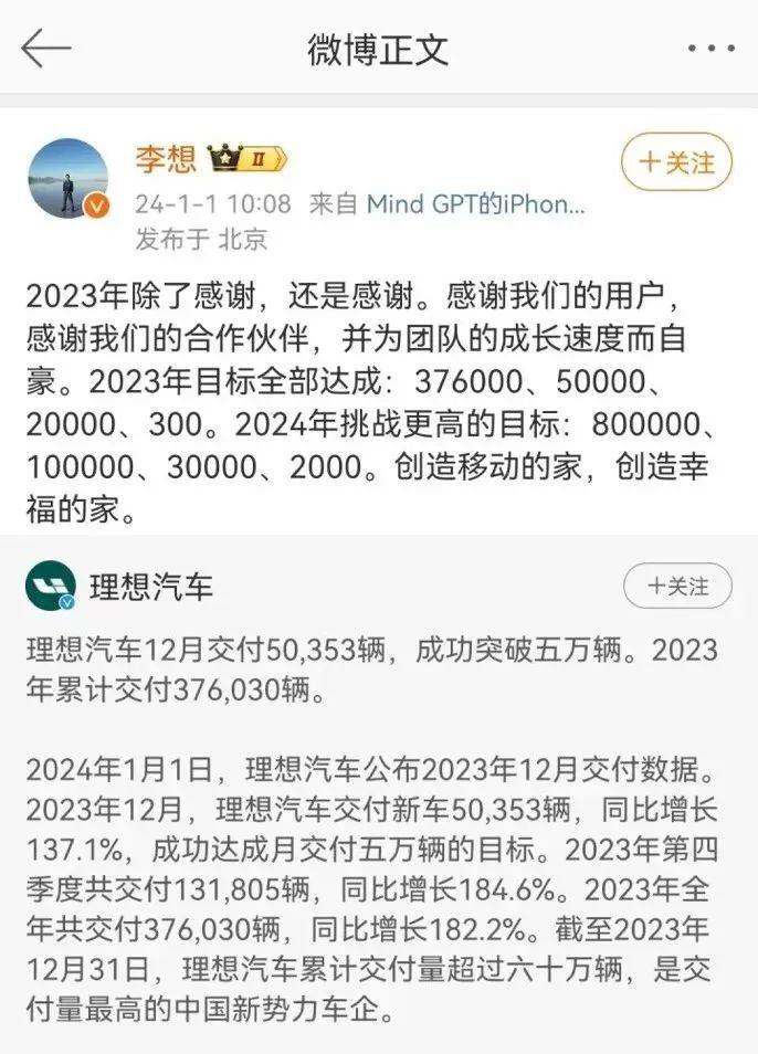 理想汽車董事長兼ceo李想在社交媒體發(fā)聲:“2023年除了感謝,還是感謝。感謝我們的用戶,感謝我們的合作伙伴,并為團隊的成長速度而自豪。2023年目標(biāo)全部達成。”