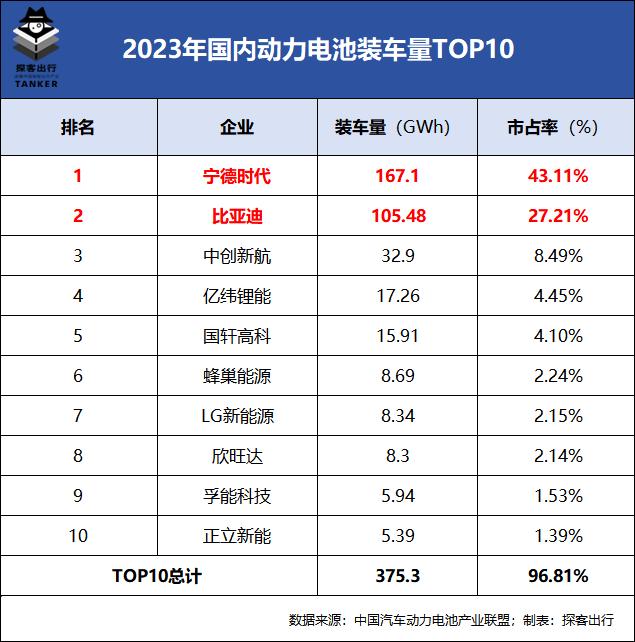 「探客出行」從中國汽車動力電池產(chǎn)業(yè)聯(lián)盟獲悉,2023年國內(nèi)動力電池裝車量TOP10企業(yè)累計(jì)裝車量約375.3GWh,占據(jù)國內(nèi)動力電池總裝機(jī)量的96.81%。其中寧德時代,比亞迪以絕對優(yōu)勢穩(wěn)居前二,累計(jì)市場占有率超七成。