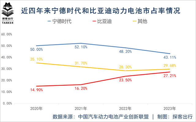 雖說,寧德時代在2023年國內(nèi)動力電池市場的市占率位居全行業(yè)第一,高達(dá)43.11%,但相比于2021年高達(dá)52.10%的市占率,已經(jīng)出現(xiàn)了明顯下滑。