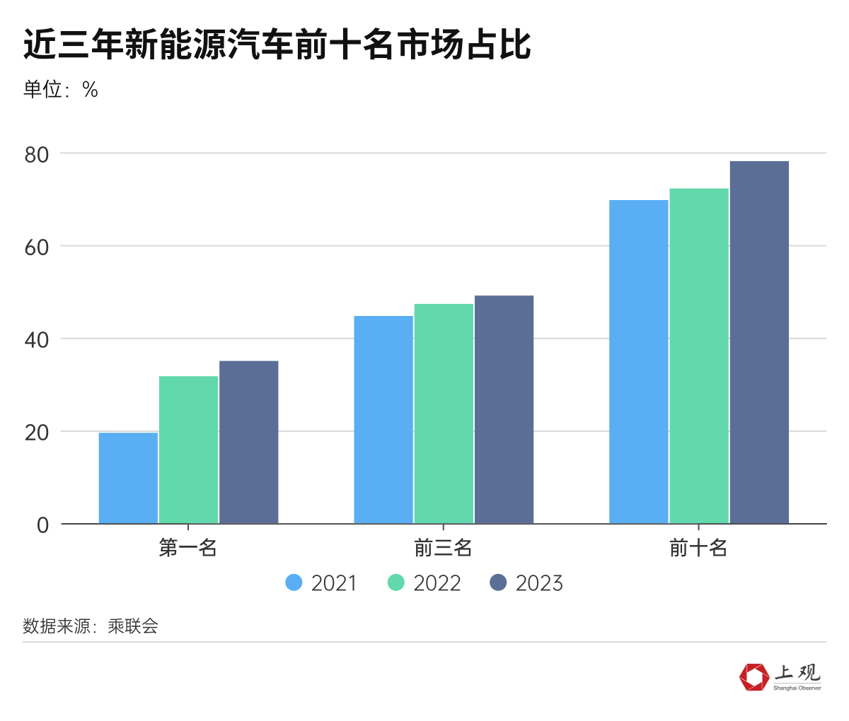 目前來看,誰贏還真說不定,但尾部企業(yè)肯定日子更難。政府補(bǔ)貼退坡后,新能源汽車銷量本來就越來越集中在頭部企業(yè)。最近三年,前十名的市場(chǎng)占比增加了約10%,接近80%。銷量第一名的比亞迪,所占的市場(chǎng)份額達(dá)到35%。而在2021年,這一占比僅為19.5%。