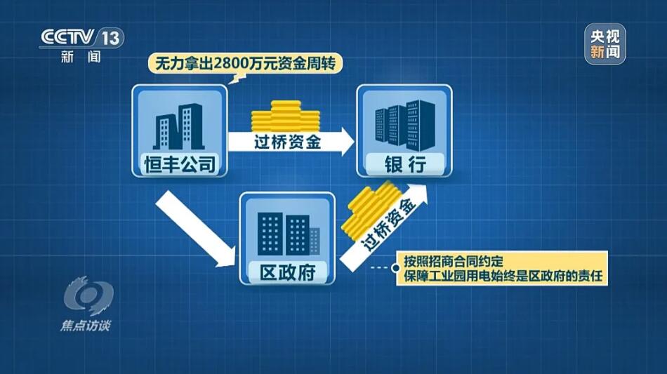 河南省駐馬店市經(jīng)濟(jì)開發(fā)區(qū)管委會副主任安寧:過橋資金2800萬,他自己拿不起,讓政府協(xié)調(diào)過橋資金,政府又為了免于擔(dān)風(fēng)險,幾經(jīng)努力,最后這個事沒有做成。說是為了免擔(dān)風(fēng)險,區(qū)政府沒有幫助協(xié)調(diào)下過橋資金,但是,也沒有履行確保恒豐公司用電負(fù)荷的約定。當(dāng)?shù)亟o產(chǎn)業(yè)園提供的一直是建設(shè)廠房時的臨時用電,220千伏變電站沒有如期建成,對企業(yè)造成的影響,當(dāng)?shù)卣质侨绾慰创哪?河南省駐馬店市經(jīng)濟(jì)開發(fā)區(qū)管委會副主任安寧:電力接上了,是臨時用電,建設(shè)期都給接了。記者:電力保障在前,還是應(yīng)該生產(chǎn)在前?河南省駐馬店市經(jīng)濟(jì)開發(fā)區(qū)管委會副主任安寧:電力保障在前。記者:正式用電的電力保障一直沒有進(jìn)行的原因是什么呢?河南省駐馬店市經(jīng)濟(jì)開發(fā)區(qū)管委會副主任安寧:這個你要問當(dāng)事人。