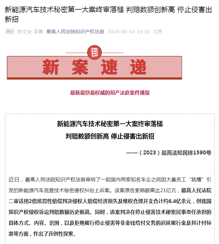 北京歷時6年,吉利起訴威馬竊取商業(yè)機密和技術侵權案件近日終審落槌。據(jù)最高人民法院知識產權法庭發(fā)布的《(2023)最高法知民終1590號新能源汽車底盤技術秘密侵權案民事判決書》顯示,原告吉利方勝訴,威馬方敗訴需賠償吉利方6.4億余元,創(chuàng)我國知識產權侵權訴訟判賠數(shù)額歷史新高。
