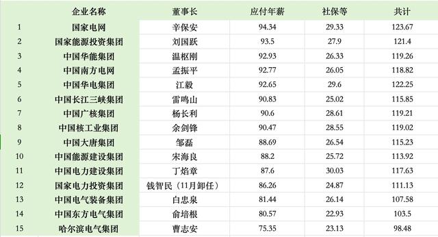 國資委近日公布了中央企業(yè)負(fù)責(zé)人2023年薪酬信息,其中包括22家能源、化工、電力央企,電力企業(yè)占15家,分別為“兩網(wǎng)兩建”(國家電網(wǎng)、南方電網(wǎng)、中國電力建設(shè)集團(tuán)、中國能源建設(shè)集團(tuán))、“五大發(fā)電”(中國大唐集團(tuán)、中國華能集團(tuán)、中國華電集團(tuán)、國家電力投資集團(tuán)、國家能源投資集團(tuán))、“三大電氣”(中國電氣裝備集團(tuán)、中國東方電氣集團(tuán)、哈爾濱電氣集團(tuán))、“兩大核電”(中國核工業(yè)集團(tuán)、中國廣核集團(tuán))以及中國長江三峽集團(tuán)。