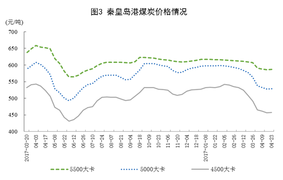 煤炭價(jià)格有所下跌。截至4月底,秦皇島5500大卡煤炭平倉價(jià)為每噸587元,比3月底下降20元;5000大卡每噸529元,下降35元;4500大卡每噸457元,下降34元。