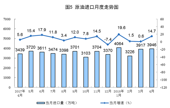 4月份,原油進(jìn)口大幅增長,進(jìn)口3946萬噸,同比增長14.7%,增速比上月加快14.1個(gè)百分點(diǎn);日均進(jìn)口131.5萬噸,再創(chuàng)歷史新高。1-4月份,進(jìn)口原油1.5億噸,同比增長8.9%。