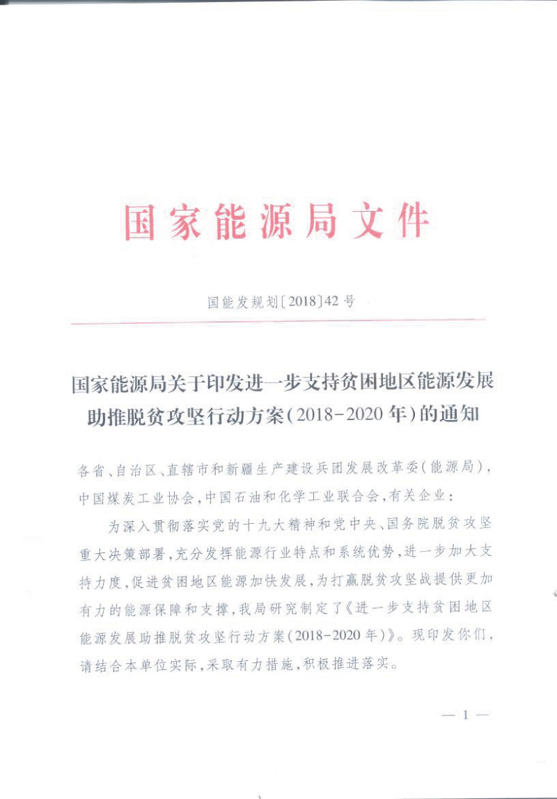 國家能源局關(guān)于印發(fā)進(jìn)一步支持貧困地區(qū)能源發(fā)展助推脫貧攻堅行動方案(2018-2020年)的通知