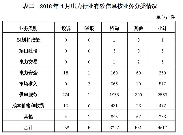 投訴舉報(bào)主要集中在電力行業(yè),共264件。從業(yè)務(wù)分類情況看,電力安全方面19件,占7.20%;市場準(zhǔn)入方面2件,占0.76%;供電服務(wù)方面225件,占85.23%;成本價格和收費(fèi)方面13件,占4.92%;其他方面5件,占1.89%。(2018年4月電力行業(yè)有效信息按業(yè)務(wù)分類情況見表二)