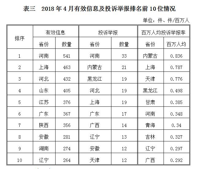 2018年4月,各?。ㄗ灾螀^(qū)、直轄市)按照有效信息數(shù)量排序,河南、上海、河北等?。ㄊ校┝腥珖?0位;按照投訴舉報(bào)數(shù)量排序,河南、內(nèi)蒙古、黑龍江等省(自治區(qū))排在全國前10位;按照百萬人均投訴舉報(bào)率排序,內(nèi)蒙古、上海、天津等?。ㄊ小⒆灾螀^(qū))位于全國前10位。(2018年4月有效信息及投訴舉報(bào)排名前10位情況見表三)