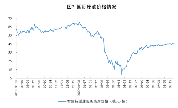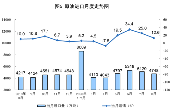原油進(jìn)口增速回落,國際原油價格小幅上漲。8月份,進(jìn)口原油4748萬噸,同比增長12.6%,增速比上月回落12.4個百分點。1—8月份,進(jìn)口原油3.7億噸,同比增長12.1%。8月28日布倫特原油現(xiàn)貨離岸價格為45.22美元/桶,比7月31日的43.13美元/桶上漲4.8%。