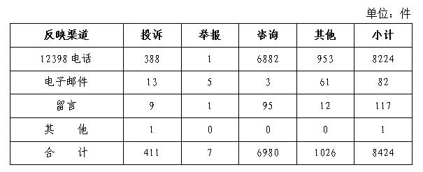 按反映渠道分類,12398電話8224件,電子郵件82件,留言117件,其他1件。(2020年10月收到有效信息情況見(jiàn)表一)