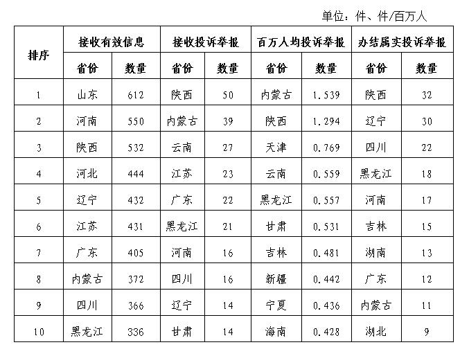 各省(自治區(qū)、直轄市)按照收到的有效信息數(shù)量排序,山東、河南、陜西、河北、遼寧、江蘇、廣東、內(nèi)蒙古、四川、黑龍江等列全國(guó)前10位;按照投訴舉報(bào)數(shù)量排序,陜西、內(nèi)蒙古、云南、江蘇、廣東、黑龍江、河南、四川、遼寧、甘肅等排在全國(guó)前10位。按照百萬(wàn)人均投訴舉報(bào)數(shù)量排序,內(nèi)蒙古、陜西、天津、云南、黑龍江、甘肅、吉林、新疆、寧夏、海南等排在全國(guó)前10位。按照辦結(jié)屬實(shí)投訴舉報(bào)數(shù)量排序,陜西、遼寧、四川、黑龍江、河南、吉林、湖南、廣東、內(nèi)蒙古、湖北等排在全國(guó)前10位。(2020年10月有效信息及投訴舉報(bào)排名前10位情況見(jiàn)表三)