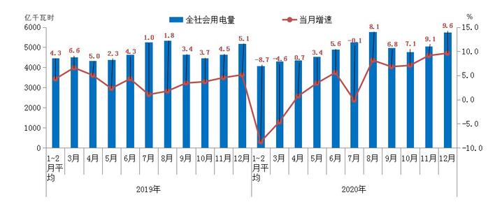 2020年四個(gè)季度我國國內(nèi)生產(chǎn)總值增速分別為-6.8%、3.2%、4.9%、6.5%,二季度起增速逐季回升。2020年,國家電網(wǎng)經(jīng)營區(qū)全社會(huì)用電量58337億千瓦時(shí),比上年增長2.5%。其中,一季度受新冠肺炎疫情影響用電量同比下降7.4%,第二、第三、第四季度用電量增速分別為3.3%、4.9%、8.7%,呈現(xiàn)穩(wěn)步回升態(tài)勢,與各季度經(jīng)濟(jì)增速走勢一致,四季度恢復(fù)態(tài)勢強(qiáng)勁。12月份,國家電網(wǎng)經(jīng)營區(qū)全社會(huì)用電量5754億千瓦時(shí),同比增長9.6%,增速創(chuàng)年內(nèi)新高,較上年同期上升4.5個(gè)百分點(diǎn),主要受工業(yè)生產(chǎn)加快、低溫寒潮天氣等因素影響。