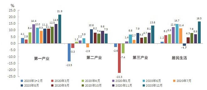 2020年,第一、二、三產(chǎn)業(yè)和居民生活用電量增速分別為10.7%、1.9%、1.4%、6.2%。其中,第一產(chǎn)業(yè)和居民生活用電量增速較上年分別上升5.0、1.5個(gè)百分點(diǎn),第二、第三產(chǎn)業(yè)用電增速較上年分別下降0.5、7.5個(gè)百分點(diǎn)。第二產(chǎn)業(yè)用電量基本恢復(fù)常態(tài)化增長,第三產(chǎn)業(yè)用電量增長態(tài)勢較正常水平仍有較大差距。12月份,第一、二、三產(chǎn)業(yè)和居民生活用電量增速分別為21.9%、7.5%、13.6%、16.5%,第二產(chǎn)業(yè)用電量增速持續(xù)維持高位;第三產(chǎn)業(yè)用電量年內(nèi)首現(xiàn)兩位數(shù)增長,恢復(fù)態(tài)勢強(qiáng)勁;居民生活用電量受低溫寒潮天氣影響,增速創(chuàng)年內(nèi)新高。