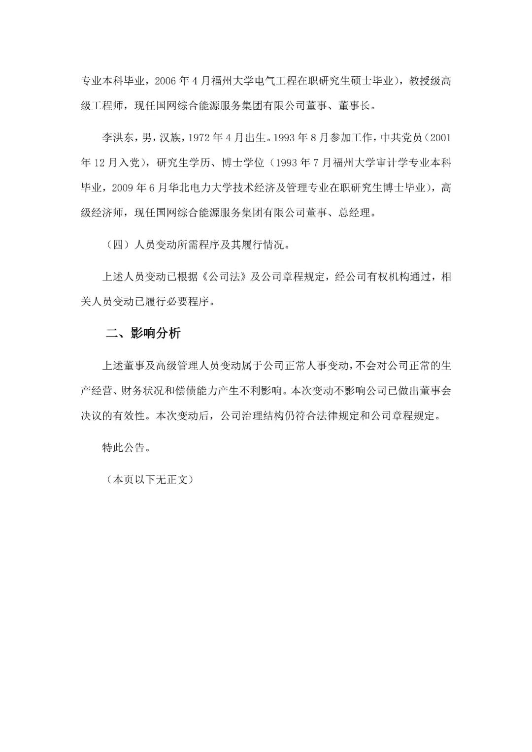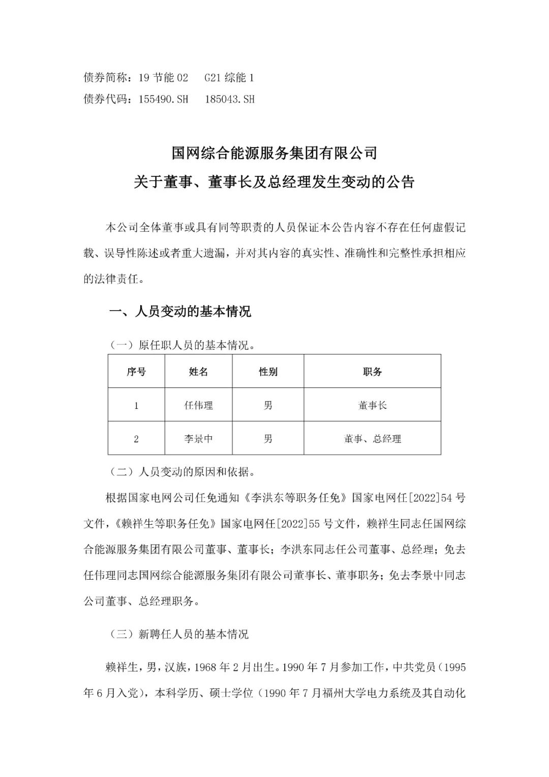 本網(wǎng)訊 4月13日,國(guó)網(wǎng)綜合能源服務(wù)集團(tuán)有限公司發(fā)布關(guān)于董事、董事長(zhǎng)及總經(jīng)理發(fā)生變動(dòng)的公告。公告顯示,賴祥生同志任國(guó)網(wǎng)綜合能源服務(wù)集團(tuán)有限公司董事、董事長(zhǎng);李洪東同志任公司董事、總經(jīng)理;免去任偉理同志國(guó)網(wǎng)綜合能源服務(wù)集團(tuán)有限公司董事長(zhǎng)、董事職務(wù);免去李景中同志公司董事、總經(jīng)理職務(wù)。