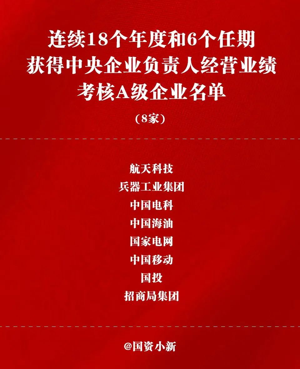 國(guó)資委對(duì)中央企業(yè)實(shí)施經(jīng)營(yíng)業(yè)績(jī)考核以來,有8家企業(yè)連續(xù)18個(gè)年度和6個(gè)任期均獲得A級(jí),分別是航天科技、兵器工業(yè)集團(tuán)、中國(guó)電科、中國(guó)海油、國(guó)家電網(wǎng)、中國(guó)移動(dòng)、國(guó)投、招商局集團(tuán)。