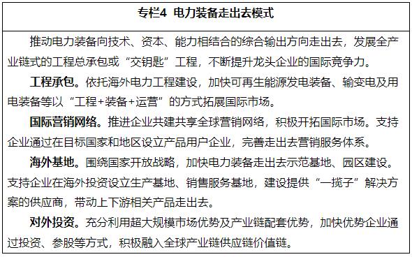 16.推動電力裝備走出去。緊緊圍繞高質(zhì)量共建“一帶一路”、深入實(shí)施《區(qū)域全面經(jīng)濟(jì)伙伴關(guān)系協(xié)定》,鼓勵(lì)優(yōu)勢電力裝備企業(yè)以多種方式加快走出去。引導(dǎo)企業(yè)取得國際認(rèn)可的服務(wù)資質(zhì),帶動技術(shù)、裝備、標(biāo)準(zhǔn)和服務(wù)走出去。支持行業(yè)組織搭建走出去信息綜合服務(wù)平臺,提供法律、咨詢、風(fēng)險(xiǎn)評估等服務(wù)。