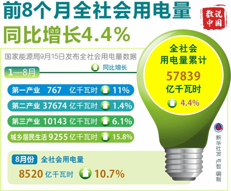 本網(wǎng)訊 國家能源局15日發(fā)布今年前8個(gè)月全社會(huì)用電量數(shù)據(jù)。今年前8個(gè)月全社會(huì)用電量累計(jì)57839億千瓦時(shí),同比增長4.4%。