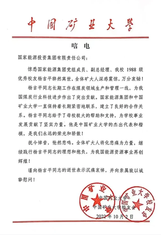 國(guó)家能源集團(tuán)黨組成員、副總經(jīng)理?xiàng)罴酵?,因突發(fā)疾病搶救無(wú)效,于2022年10月2日9時(shí)33分在北京不幸逝世,享年53歲。他的遺體送別會(huì),于10月4日上午11:30在北京八寶山殯儀館舉行。