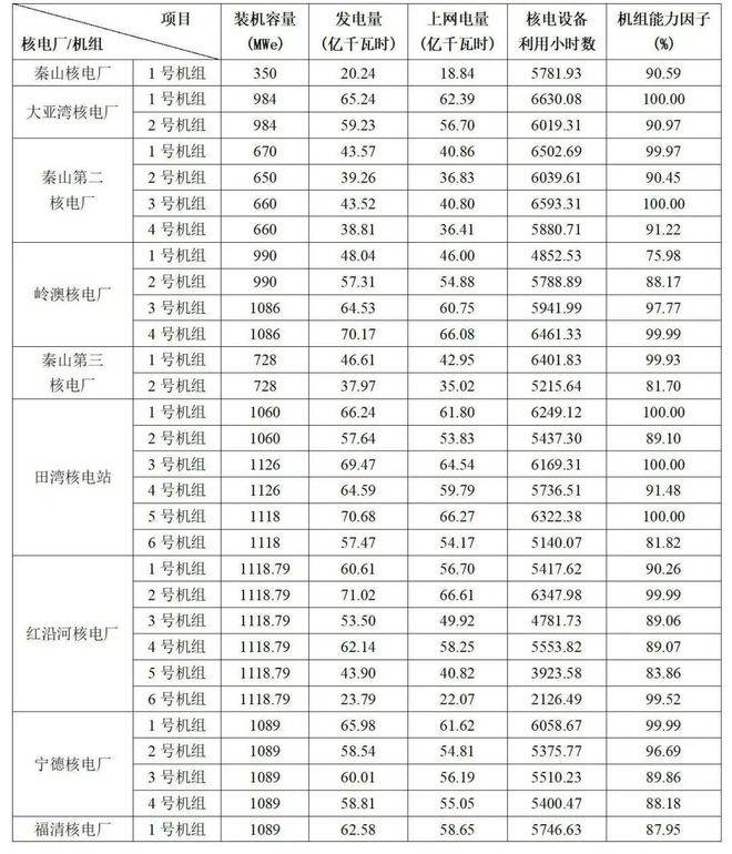 3)本表“合計值/整體值/平均值”中,裝機容量、發(fā)電量、上網(wǎng)電量為各機組合計值,核電設(shè)備利用小時數(shù)為全部機組整體值,機組能力因子為全部機組的算數(shù)平均值。