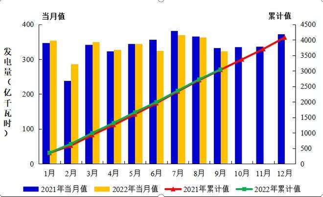 圖2:2021年1月至2022年9月全國運行核電機組發(fā)電量趨勢