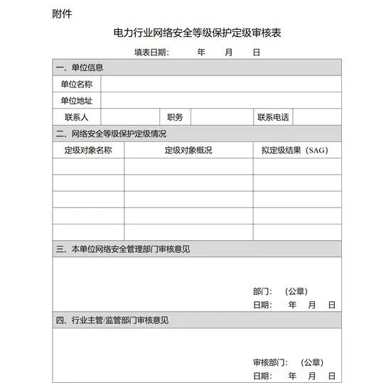 第九條 電力企業(yè)辦理網(wǎng)絡(luò)安全等級保護(hù)定級審核手續(xù)時,應(yīng)當(dāng)提交《電力行業(yè)網(wǎng)絡(luò)安全等級保護(hù)定級審核表》(詳見附件),含各定級對象的定級報告及專家評審意見。