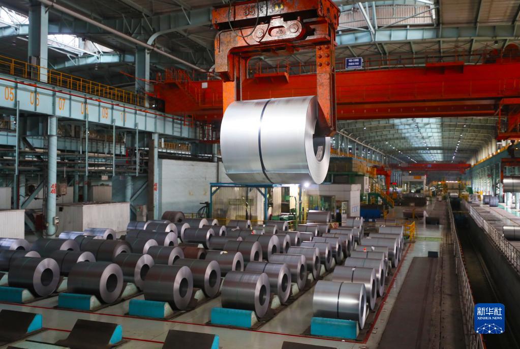 在本鋼冷軋廠,吊車在吊裝鋼卷(2021年8月18日攝)。