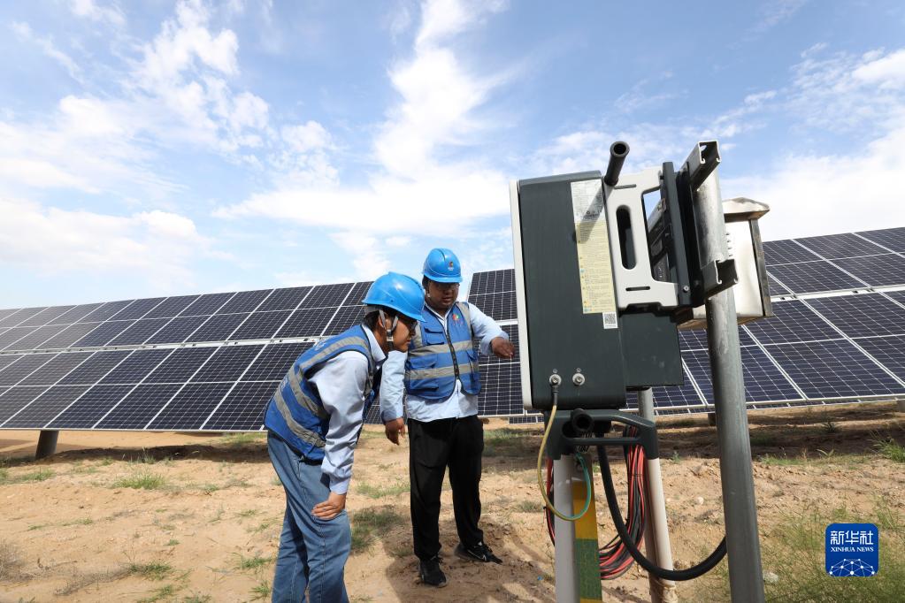 國家電投五凌電力余丁光伏電站職工在檢修設備(2022年8月31日攝)。