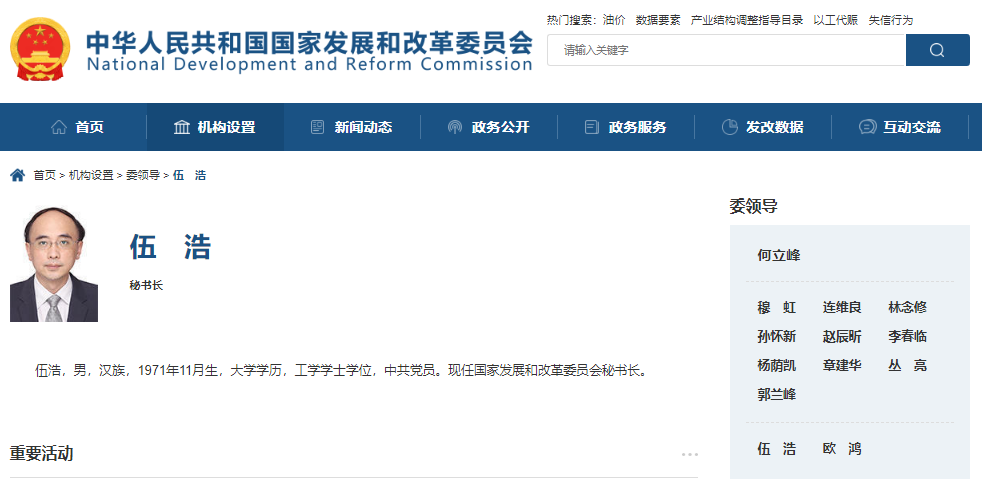據國家發(fā)改委官方網站“委領導”欄目最新名單顯示,伍浩已任國家發(fā)改委秘書長。