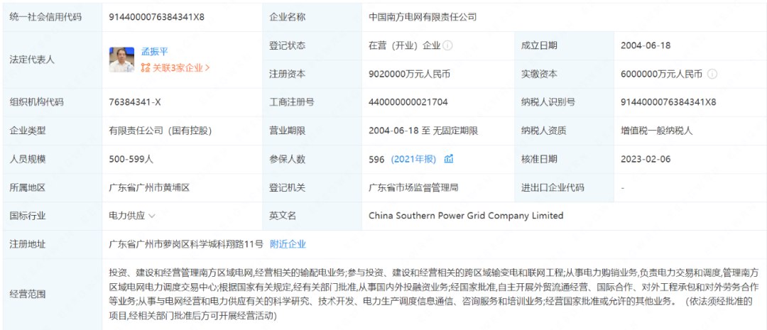 2月6日,中國(guó)南方電網(wǎng)有限責(zé)任公司發(fā)生工商變更。