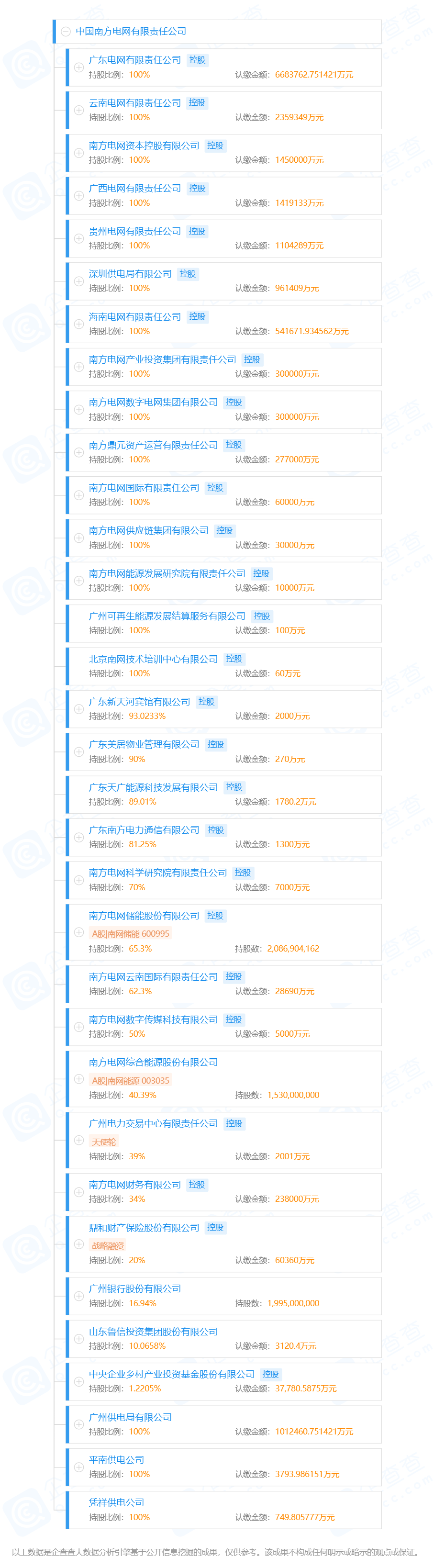 南方電網(wǎng)對(duì)外投資控股33家企業(yè),如下圖所示。