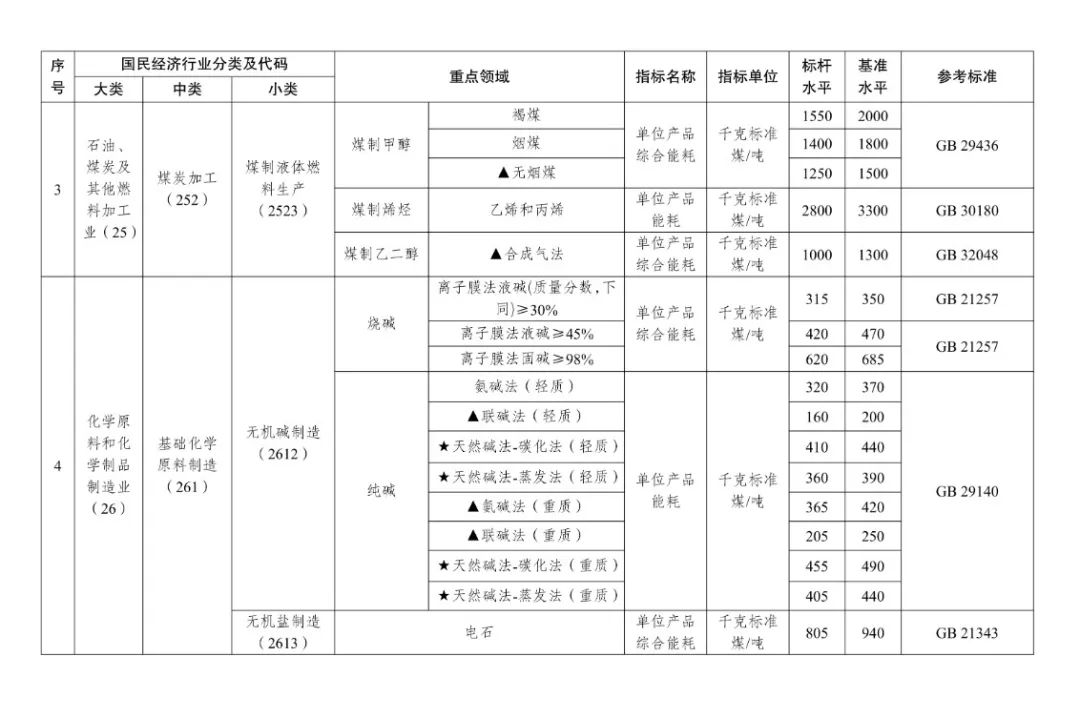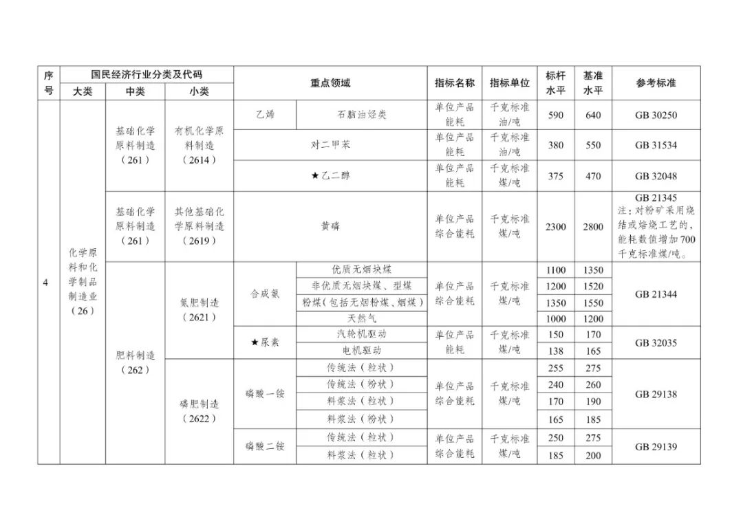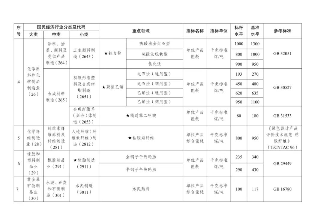 結(jié)合工業(yè)重點(diǎn)領(lǐng)域產(chǎn)品能耗、規(guī)模體量、技術(shù)現(xiàn)狀和改造潛力等,進(jìn)一步拓展能效約束領(lǐng)域。在此前明確煉油、煤制焦炭、煤制甲醇、煤制烯烴、煤制乙二醇、燒堿、純堿、電石、乙烯、對(duì)二甲苯、黃磷、合成氨、磷酸一銨、磷酸二銨、水泥熟料、平板玻璃、建筑陶瓷、衛(wèi)生陶瓷、煉鐵、煉鋼、鐵合金冶煉、銅冶煉、鉛冶煉、鋅冶煉、電解鋁等25個(gè)重點(diǎn)領(lǐng)域能效標(biāo)桿水平和基準(zhǔn)水平的基礎(chǔ)上,增加乙二醇,尿素,鈦白粉,聚氯乙烯,精對(duì)苯二甲酸,子午線輪胎,工業(yè)硅,衛(wèi)生紙?jiān)?、紙巾原紙,棉、化纖及混紡機(jī)織物,針織物、紗線,粘膠短纖維等11個(gè)領(lǐng)域,進(jìn)一步擴(kuò)大工業(yè)重點(diǎn)領(lǐng)域節(jié)能降碳改造升級(jí)范圍。