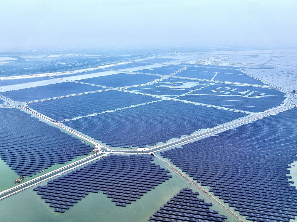 圖為華電天津海晶100萬千瓦“鹽光互補(bǔ)”光伏項(xiàng)目