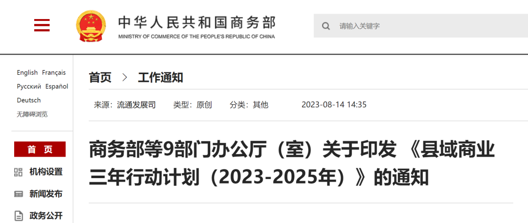 8月14日,商務部等9部門辦公廳(室)發(fā)布關(guān)于印發(fā) 《縣域商業(yè)三年行動計劃(2023-2025年)》(以下簡稱《計劃》)的通知。