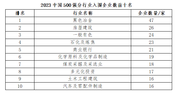 2023中國企業(yè)500強(qiáng)中,制造業(yè)264家;服務(wù)業(yè)164家;其他行業(yè)72家。產(chǎn)業(yè)結(jié)構(gòu)繼續(xù)優(yōu)化,電力電氣設(shè)備制造、通信設(shè)備制造業(yè)等行業(yè)入圍企業(yè)數(shù)量增加;黑色冶金、房屋建筑、住宅地產(chǎn)等行業(yè)入圍企業(yè)數(shù)量減少。