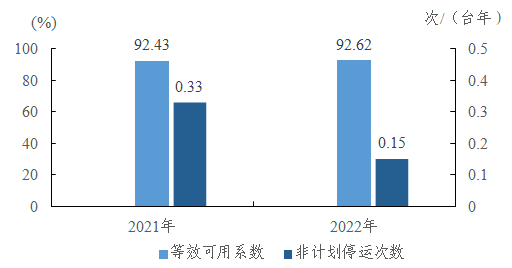 10萬千瓦及以上燃?xì)?蒸汽聯(lián)合循環(huán)機(jī)組等效可用系數(shù)92.62%,同比增加0.19個(gè)百分點(diǎn);非計(jì)劃停運(yùn)0.15次/臺(tái)年,同比下降0.18次/臺(tái)年。