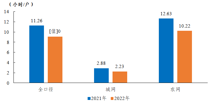 全國用戶平均停電時(shí)間9.10小時(shí)/戶,同比減少2.16小時(shí)/戶,其中城網(wǎng)2.23小時(shí)/戶,農(nóng)網(wǎng)10.22小時(shí)/戶。城網(wǎng)與農(nóng)網(wǎng)相差7.99小時(shí)/戶。