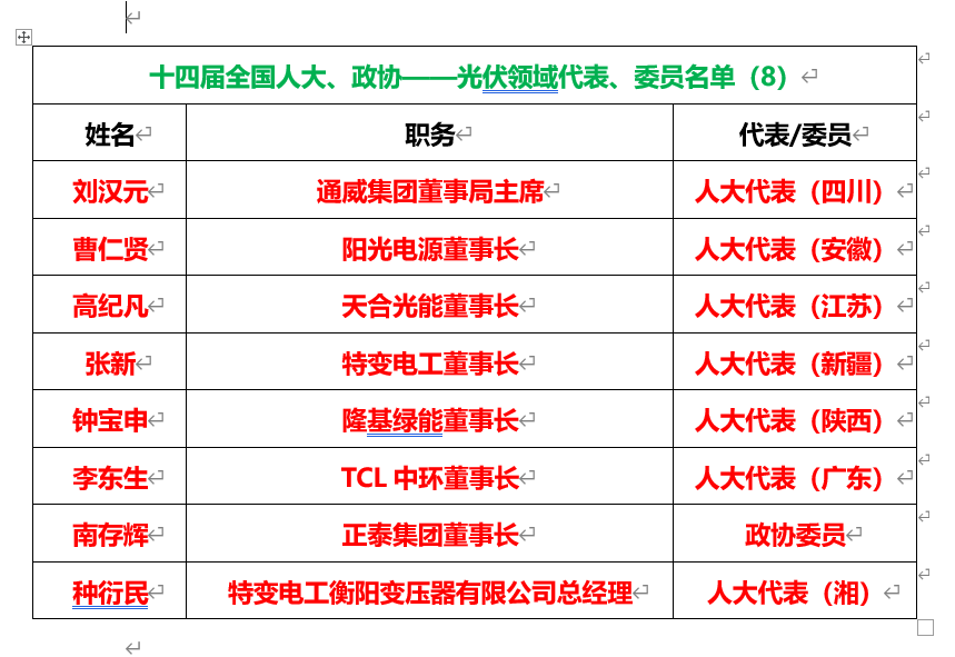 光伏領域共有8位行業(yè)領袖當選十四屆全國人大代表、政協(xié)委員,數(shù)量創(chuàng)歷年之最。其中,特變電工有2人當選,單家公司最多。