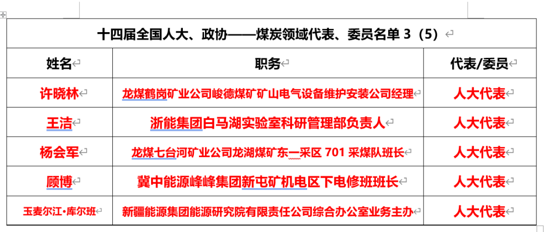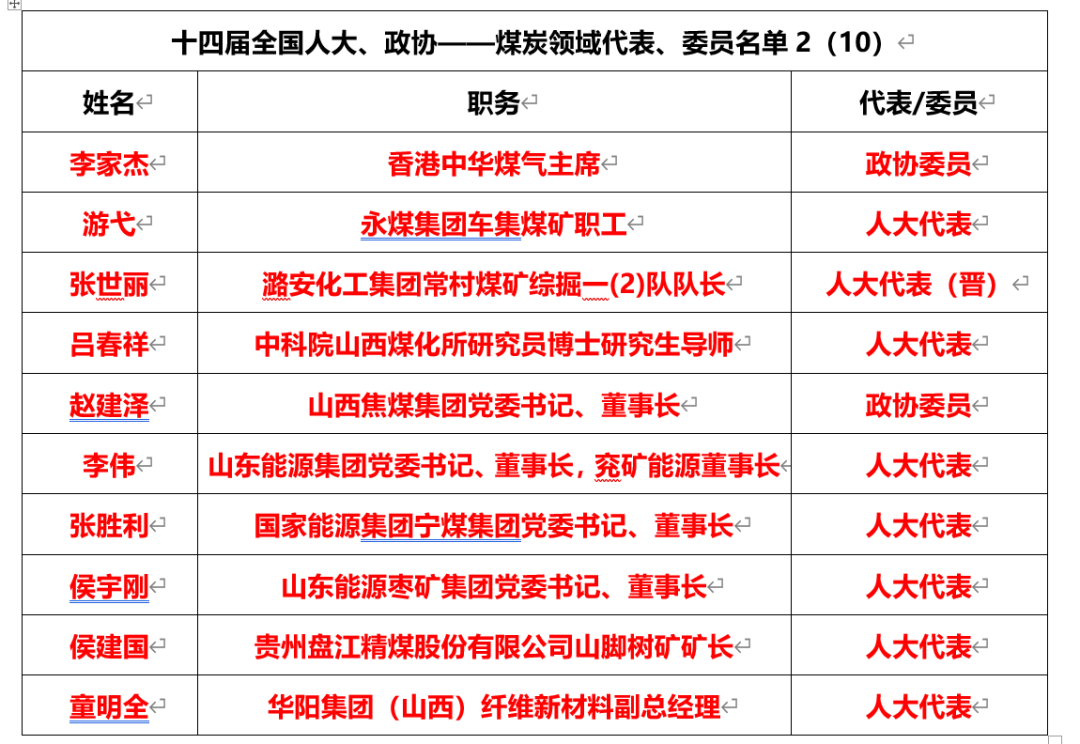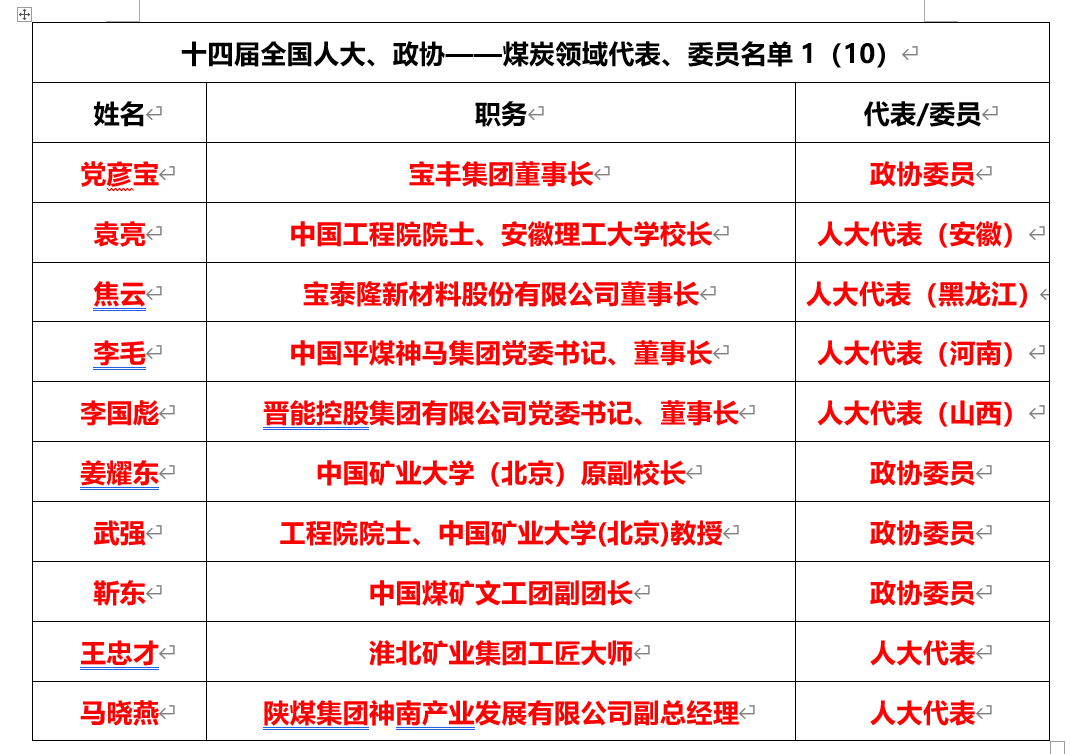 煤炭領域有25人當選十四屆全國人大代表、政協(xié)委員,全國人大代表有19名,全國政協(xié)委員有6名。