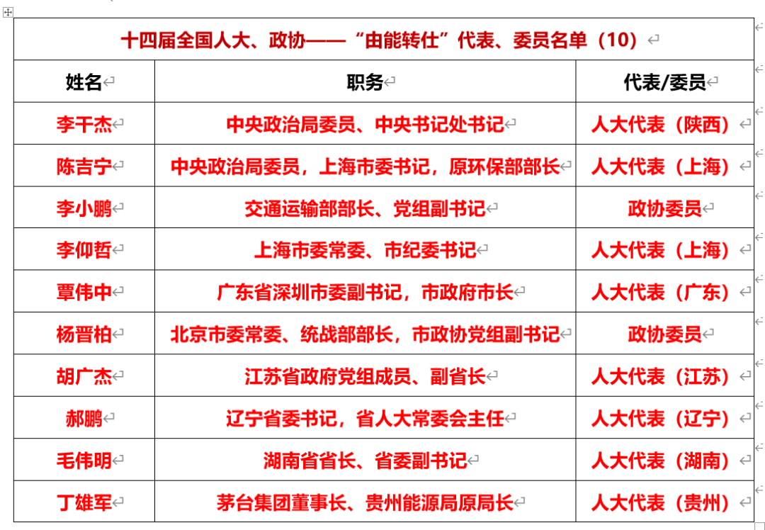 “由能轉仕”的十四屆全國人大代表、政協(xié)委員有10人,其中全國人大代表8人,政協(xié)委員2人。如中央政治局委員、中央書記處書記李干杰,曾任生態(tài)環(huán)境部原部長、黨組書記,中央政治局委員、上海市委書記陳吉寧曾任環(huán)保部部長,交通運輸部部長李小鵬曾任中國華能總經(jīng)理,上海市委常委、紀委書記李仰哲曾任國家能源局副局長,深圳市長覃偉中曾任中國石油副總經(jīng)理,遼寧省委書記郝鵬曾任國務院國資委主任,江蘇省副省長胡廣杰曾任中國海油副總經(jīng)理,湖南省省長毛偉明曾任國家電網(wǎng)董事長,丁雄軍曾任貴州能源局原局長。