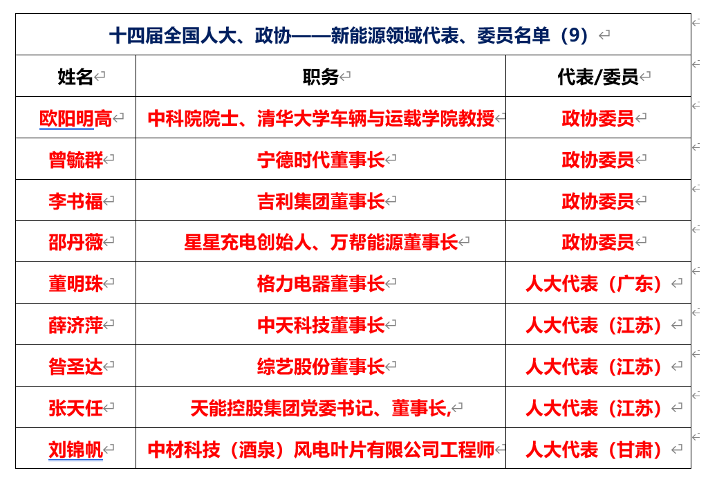新能源領域有7人當選十四屆全國人大代表、政協(xié)委員,格力電器董明珠、寧德時代曾毓群、吉利集團李書福等人當選。