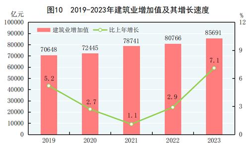 全年建筑業(yè)增加值85691億元,比上年增長7.1%。全國具有資質(zhì)等級的總承包和專業(yè)承包建筑業(yè)企業(yè)利潤8326億元,比上年增長0.2%,其中國有控股企業(yè)4019億元,增長4.3%。