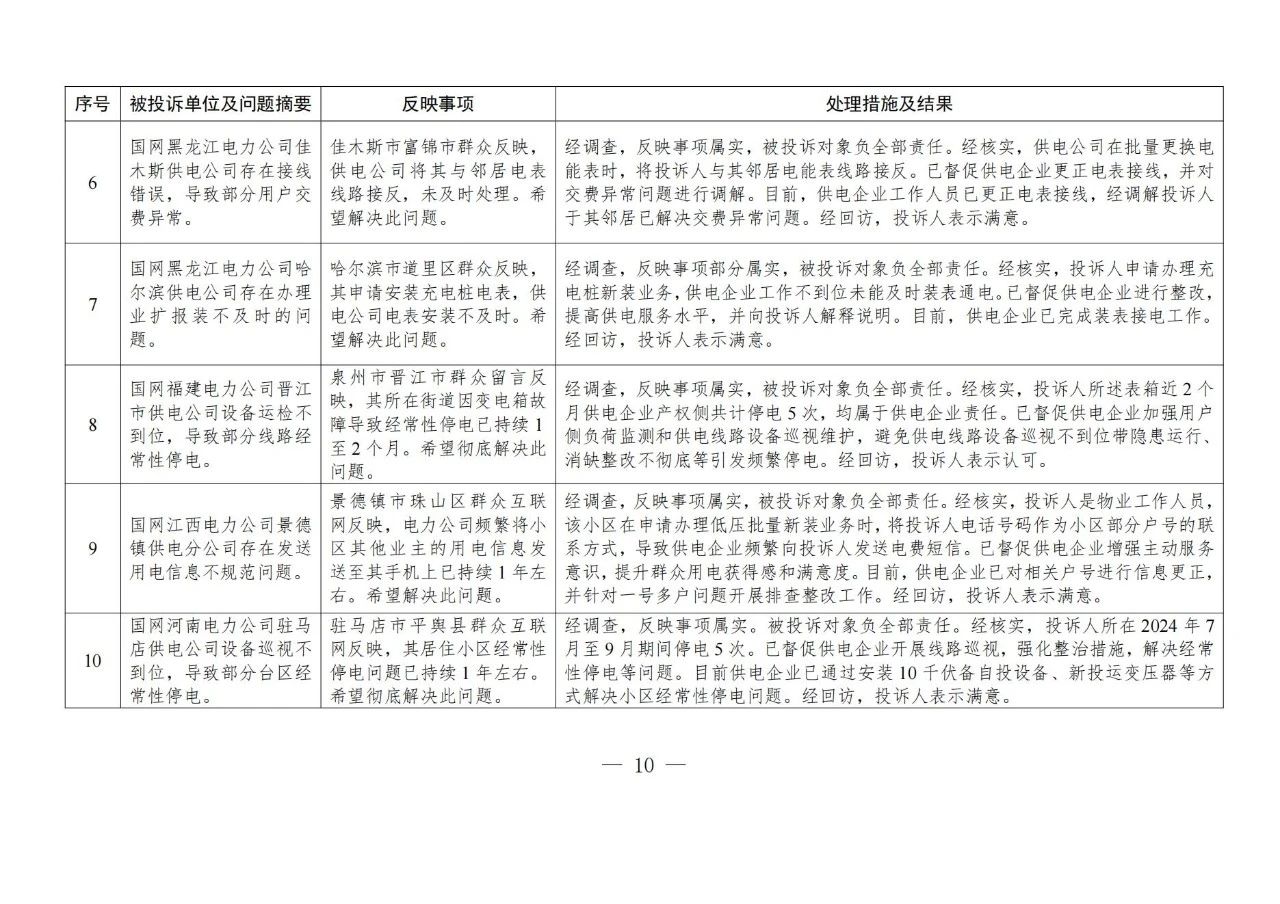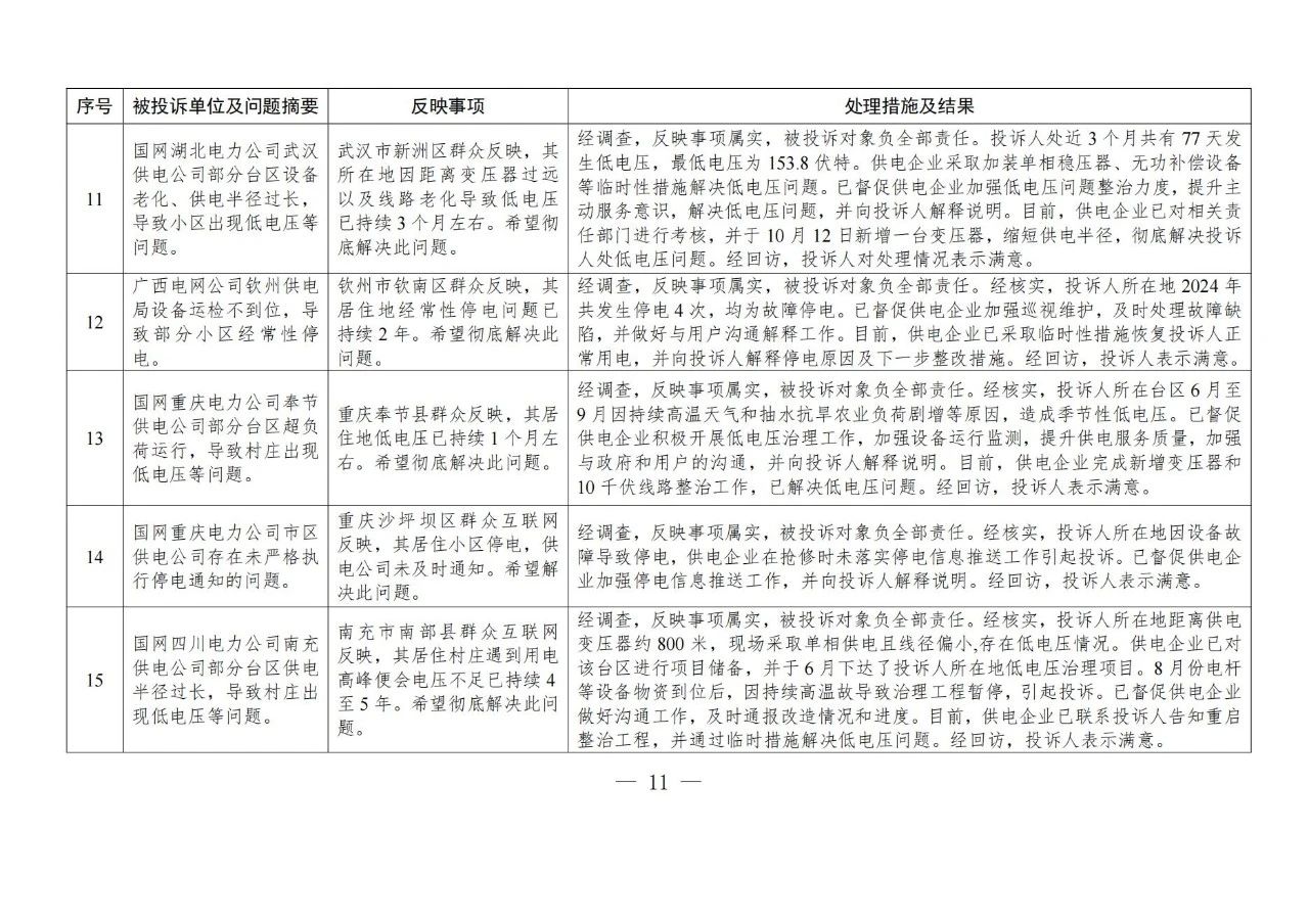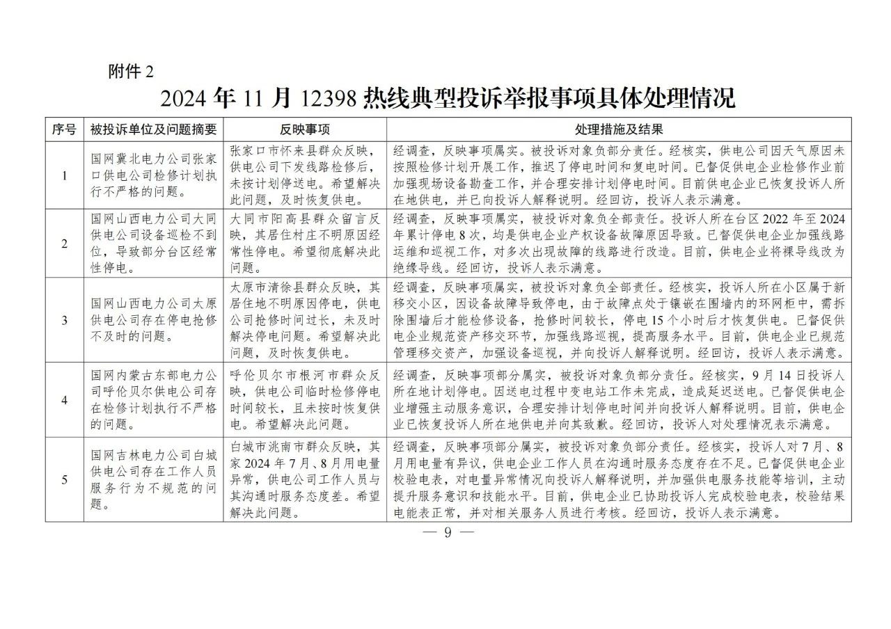 針對群眾反映的投訴舉報,國家能源局派出機構嚴格按照有關法規(guī)政策規(guī)定進行處理。一是督促供電企業(yè)進一步規(guī)范用電報裝管理,強化業(yè)擴報裝全流程管控,嚴格按照規(guī)定時限完成裝表接電;二是要求供電企業(yè)加強設備隱患排查整治,強化停電搶修管理,合理規(guī)劃計劃停電,增加搶修資源投入,提升設備管控和停電搶修能力,切實提高供電可靠性;三是通過行政處罰、監(jiān)管約談、責令整改等方式,糾正有關企業(yè)違法違規(guī)行為,維護公平公正的市場秩序和群眾合法權益;四是通過解釋說明、澄清事實,消除群眾誤解。(2024年11月12398熱線典型投訴舉報事項具體處理情況見附件2)