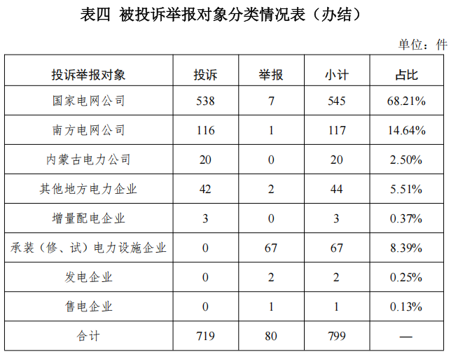 從被投訴舉報對象看,供電企業(yè)719件、占投訴舉報總數(shù)的89.99%,其中國家電網(wǎng)公司545件、占比68.21%,南方電網(wǎng)公司117件、占比14.64%,內蒙古電力公司20件、占比2.50%,其他地方電力企業(yè)44件、占比5.51%,增量配電企業(yè)3件、占比0.37%;承裝(修、試)電力設施企業(yè)67件、占比8.39%;發(fā)電企業(yè)2件、占比0.25%;電力交易機構1件、占比0.13%。