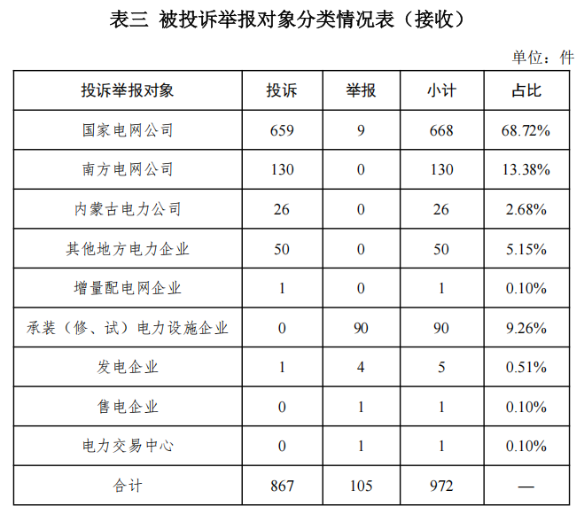 供電企業(yè)875件、占投訴舉報總數(shù)的90.02%,其中國家電網(wǎng)公司668件、占投訴舉報總數(shù)的68.72%,南方電網(wǎng)公司130件、占投訴舉報總數(shù)的13.37%,內蒙古電力公司26件、占投訴舉報總數(shù)的2.67%,其他地方電力企業(yè)50件、占投訴舉報總數(shù)的5.14%,增量配電網(wǎng)企業(yè)1件、占投訴舉報總數(shù)的0.10%;承裝(修、試)電力設施企業(yè)90件、占投訴舉報總數(shù)的9.26%;發(fā)電企業(yè)5件,占投訴舉報總數(shù)的0.51%;售電企業(yè)1件、占投訴舉報總數(shù)的0.1%;電力交易中心1件、占投訴舉報總數(shù)的0.1%。